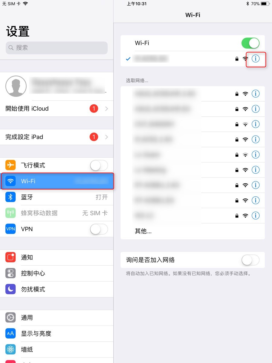 找到您当前已连接的Wi-Fi网络,点击右侧的"信息"图标(ⓘ)进入网络详情。