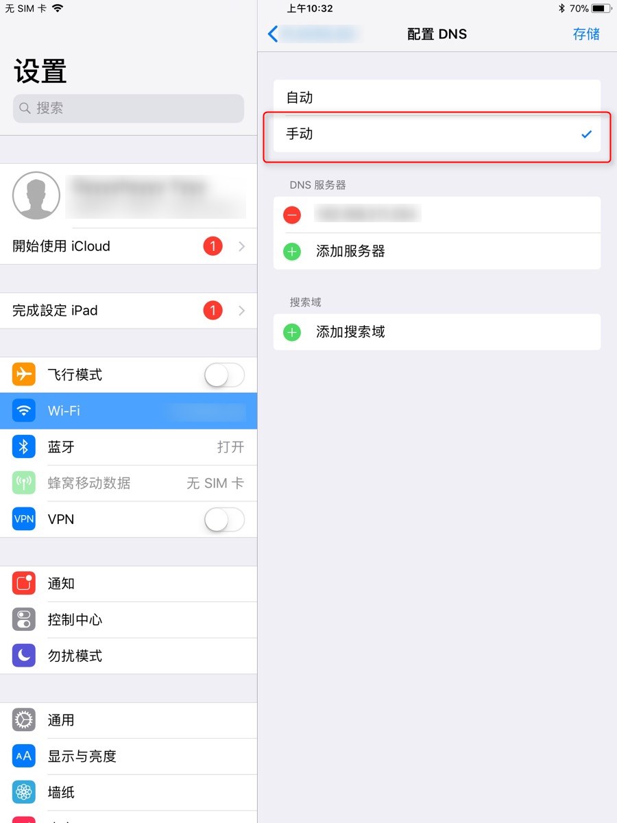 点击DNS选项,选择"手动"配置模式(默认为自动)。