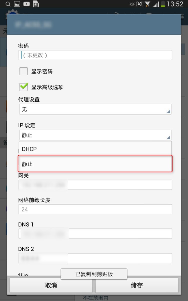 点击"IP设置"选项,在弹出的菜单中选择"静态"(默认为DHCP)。